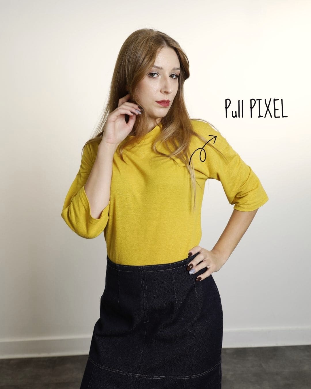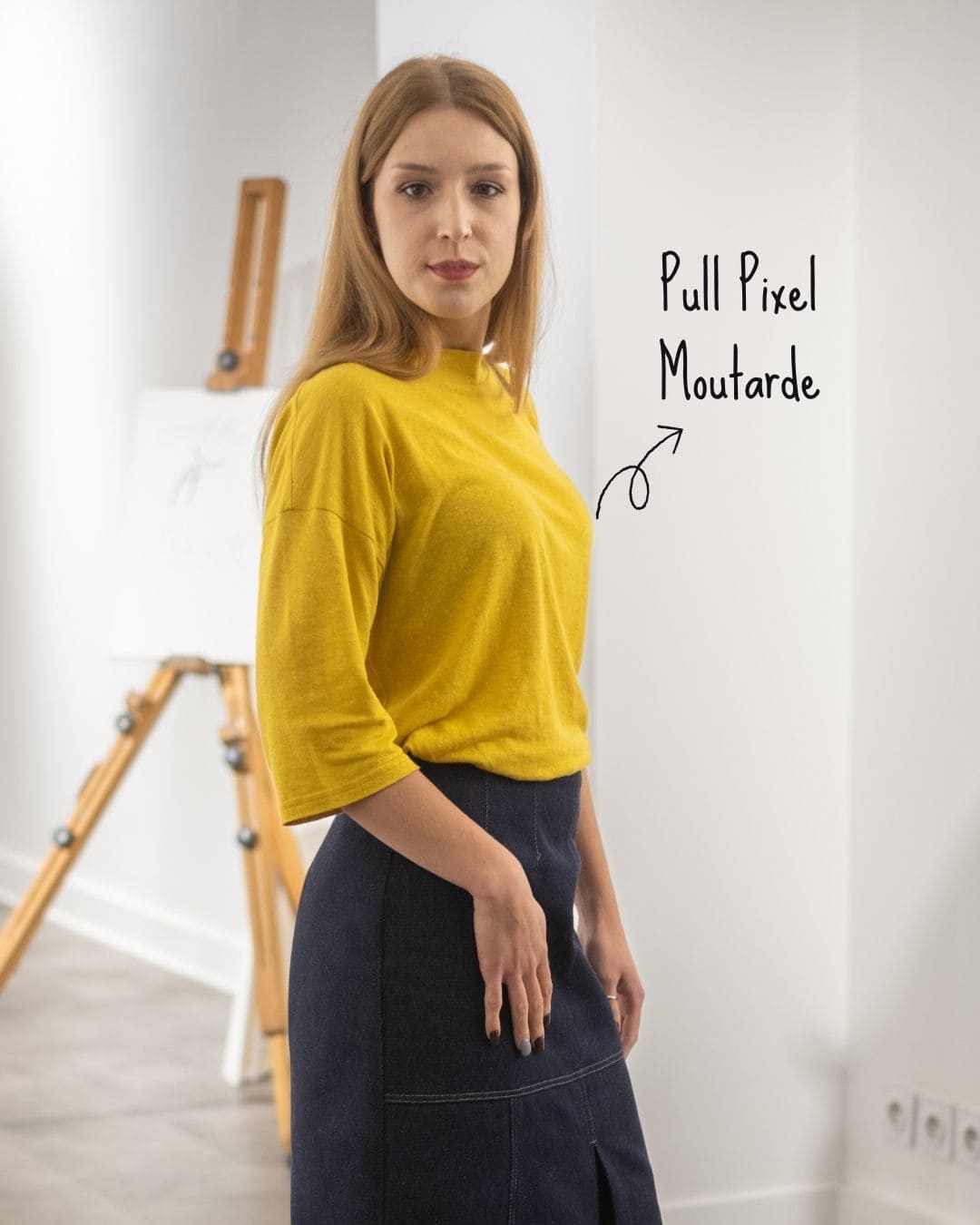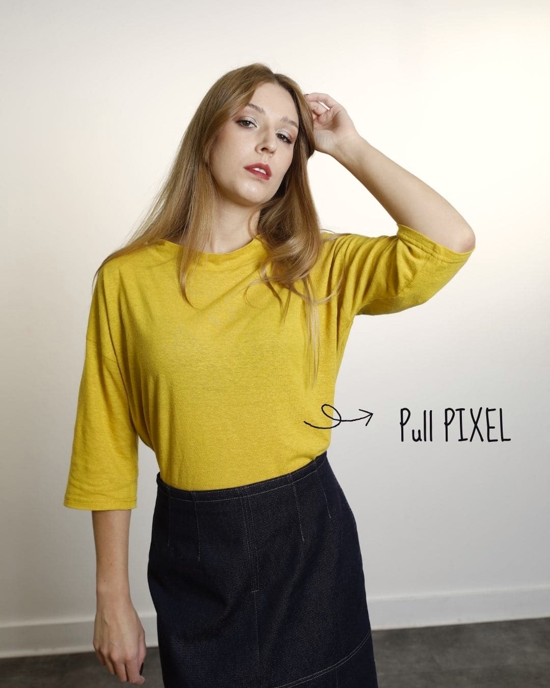 Pull « PIXEL » en coloris moutarde, manches 3/4 droites, avec encolure arrondie.