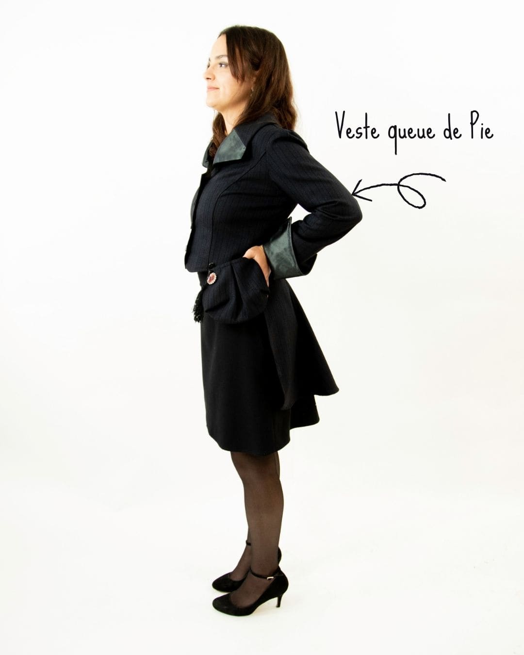 Veste courte queue de pie de style vintage en gabardine anthracite à fines rayures noires.